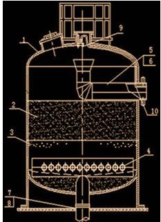 1-罐體;2-濾料層;3-墊料層;4-集配水管;5-進水管;6-反沖洗排水管;7-出水管;8-反沖洗進水管;9-自動排氣閥;10-排氣管